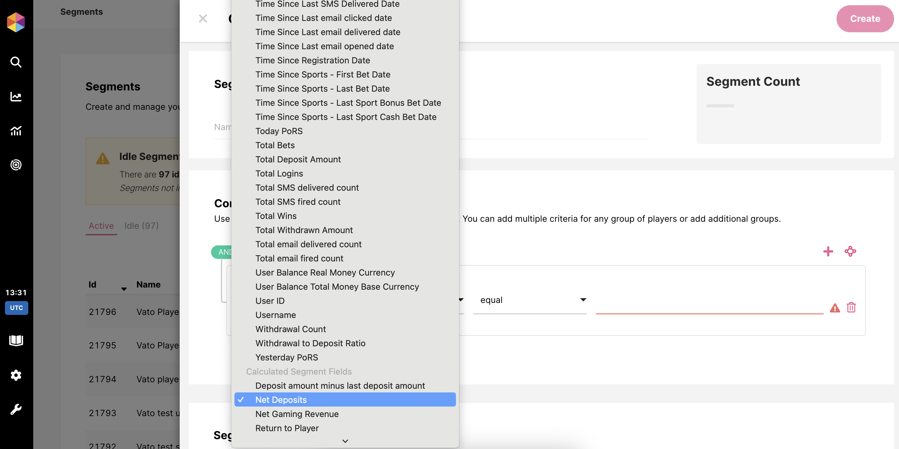 Esses Campos de Segmento Calculados podem então ser usados para direcionar grupos específicos de jogadores, como ‘Depósitos Líquidos maiores que X’ em uma Atividade ou Ciclo de Vida.