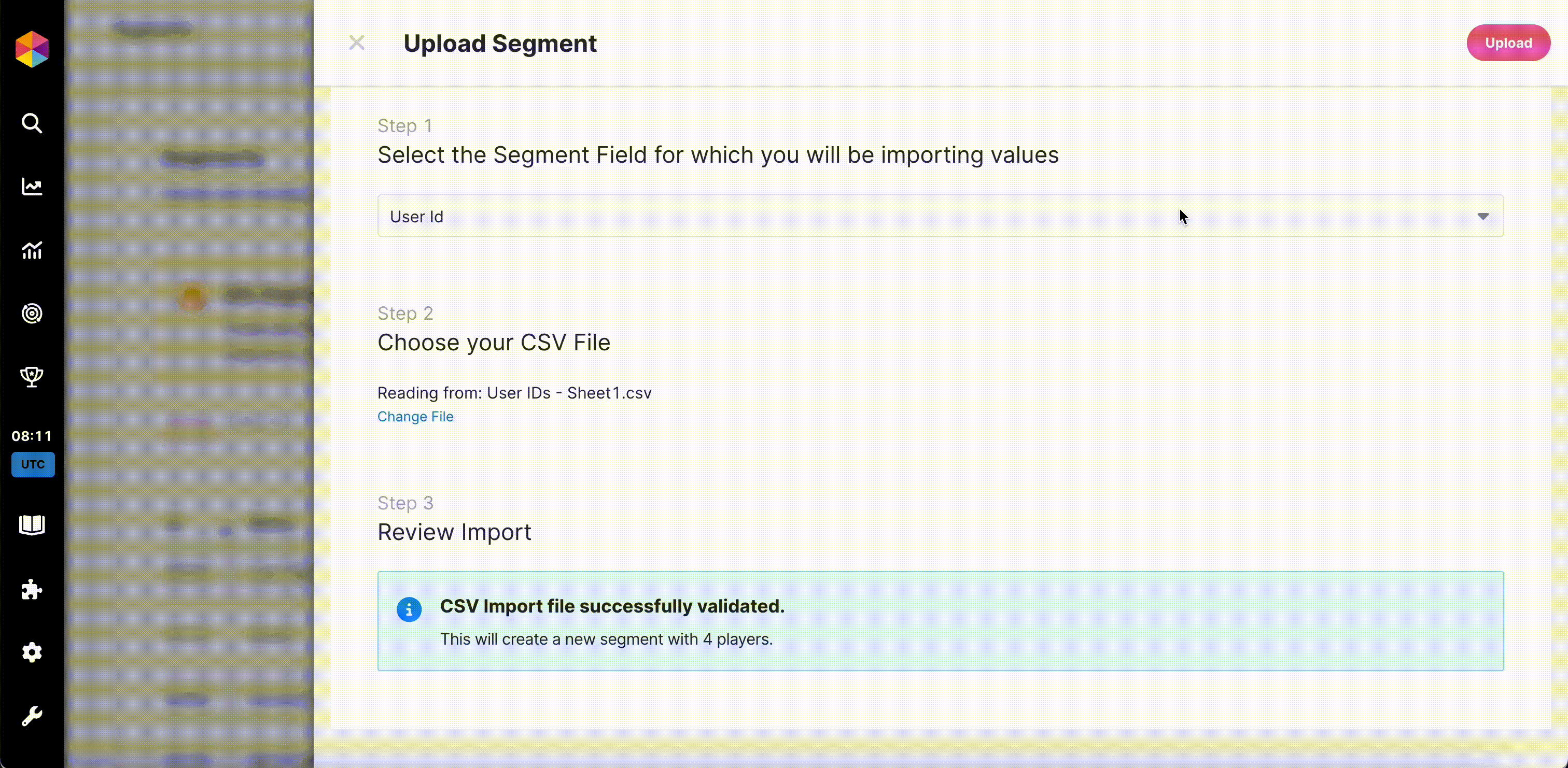 A precisão dos dados é fundamental. Garanta que os valores do seu CSV correspondam ao Campo de Segmento selecionado.