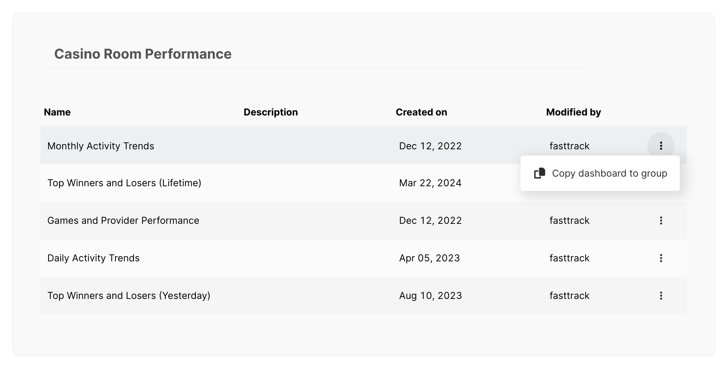 Observe que os 'Dashboards do Sistema' são uma seção somente leitura, pois você não pode construir ou editar nenhum Dashboard encontrado aqui. Contudo, você pode copiar qualquer um dos Dashboards para sua seção de Dashboards Privados ou da Marca. A partir daí, você poderá fazer quaisquer edições na versão recém-copiada.