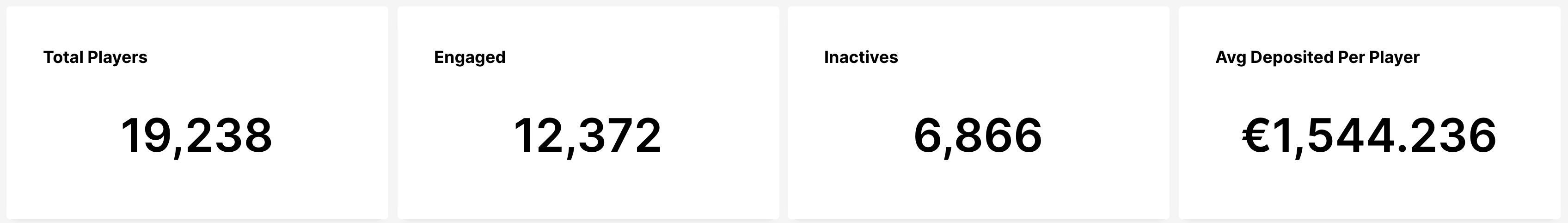 Inativos - Inativos refere-se a todos os jogadores, dentro do Total de Jogadores, que se enquadram no segmento Inativo / Perdido / Morto . Em outras palavras, qualquer jogador que não pertença ao grupo de jogadores engajados.