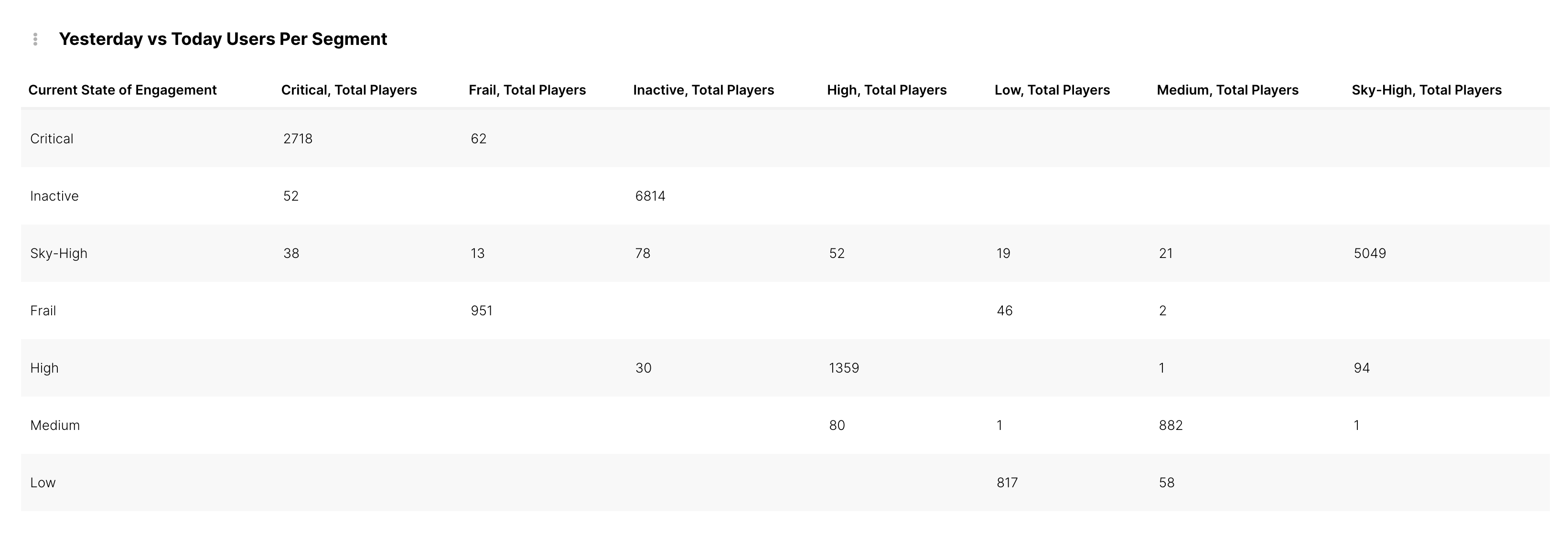 Apresentamos esta informação na matriz Segmento Ontem versus Hoje . Esta matriz documenta os movimentos dos jogadores e o Segmento ao qual o jogador pertencia ontem versus o Segmento ao qual o jogador pertence hoje. Esta informação é calculada diariamente.