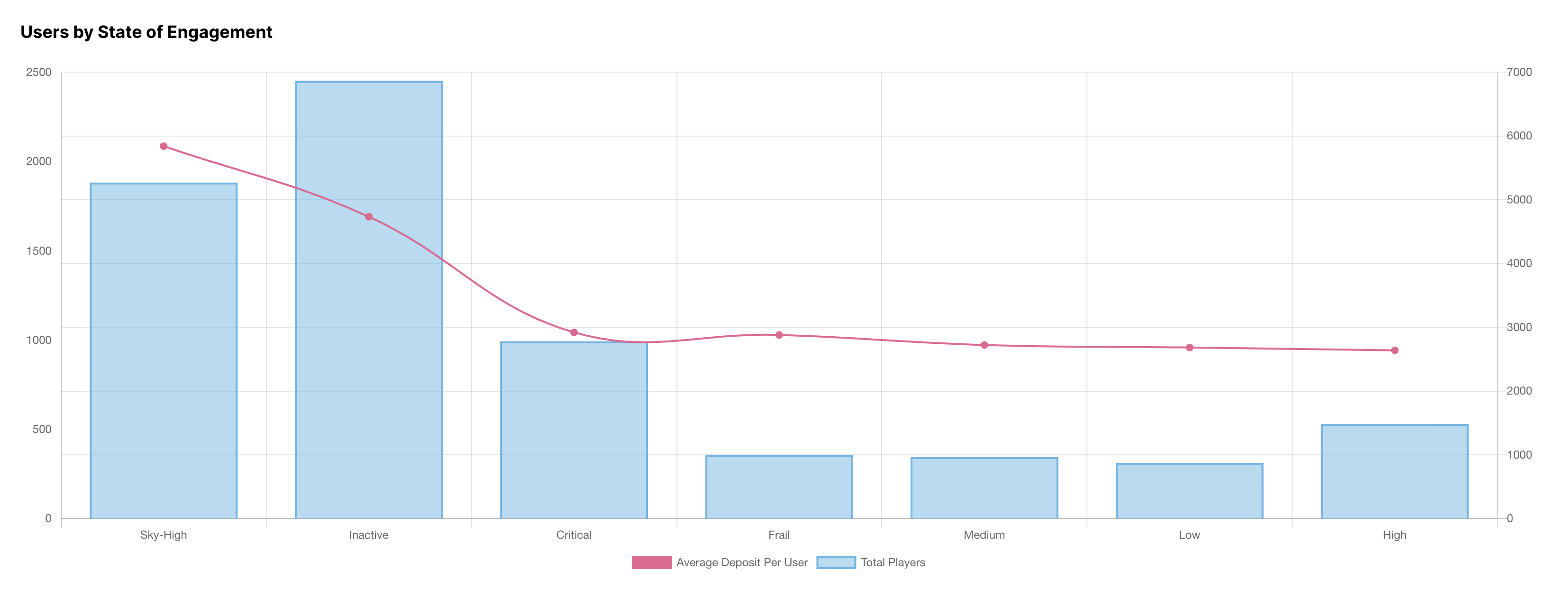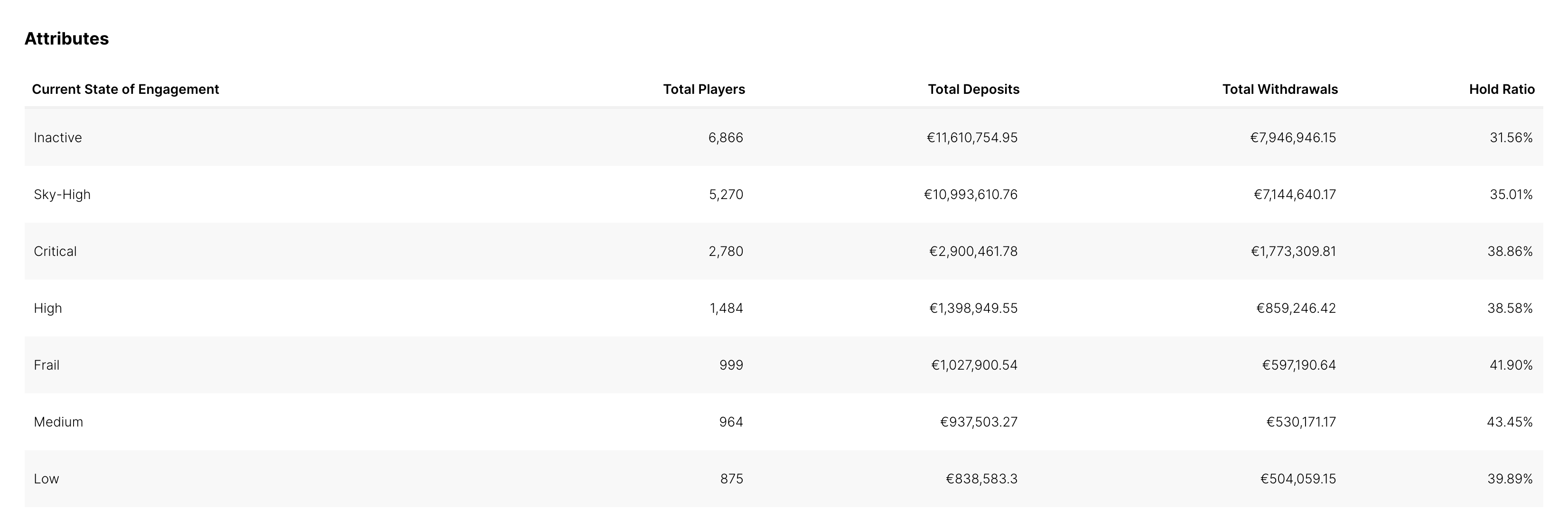 Engajados - Refere-se a todos aqueles jogadores, dentro do Total de Jogadores, que se enquadram nos segmentos ativos (Altíssimo, Alto, Médio, Baixo, Frágil ou Crítico) são classificados como engajados.