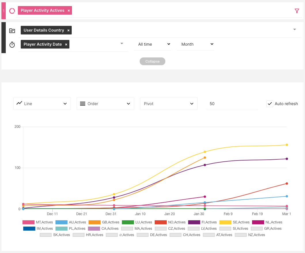 No gráfico de linha acima, mantivemos exatamente as mesmas Medidas e Dimensões. O que fizemos, além disso, foi adicionar um filtro à nossa Medida. estamos acompanhando a tendência de jogadores ativos, dividida por país, mensalmente.