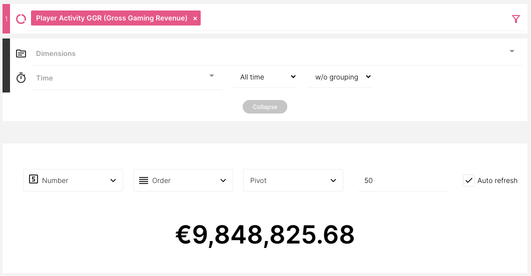 Como não temos filtros ou Dimensão de Tempo adicionados, o valor/número representa o GGR de todo o tempo.