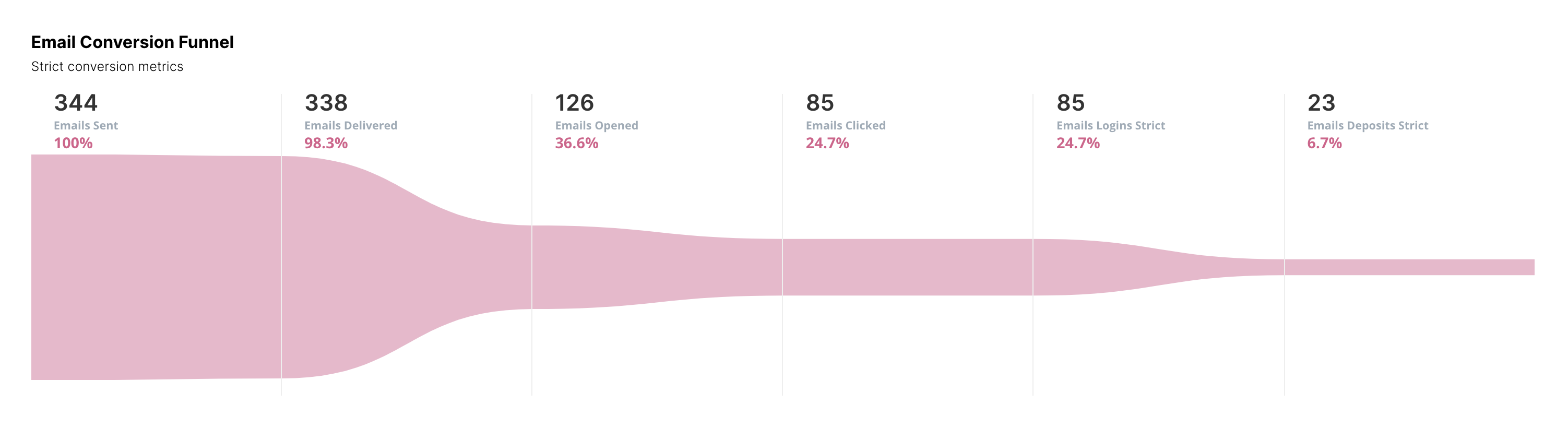Olhando o exemplo abaixo você tem um funil de e-mail strict. Para te dar uma ideia, para alcançar o fim do funil (depósitos) um jogador deve ter seguido e feito parte de todas as etapas anteriores do funil.