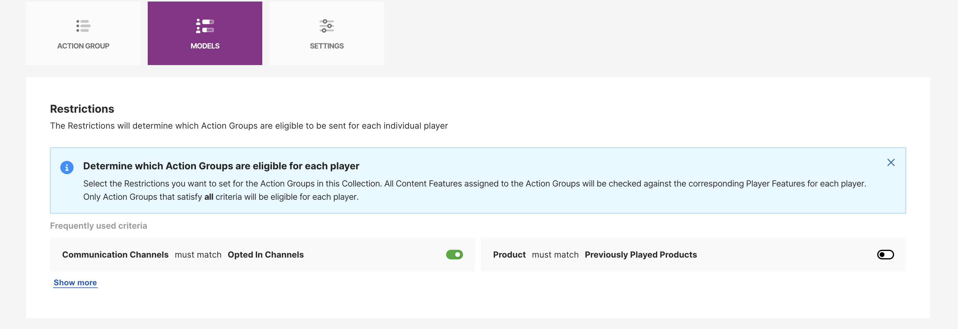 Qualquer Grupo de Ação que passe pela etapa de Restrições, então passará pela Personalização etapa (definida para a Collection) para garantir que os jogadores recebam o Grupo de Ação que seja a melhor correspondência para eles.