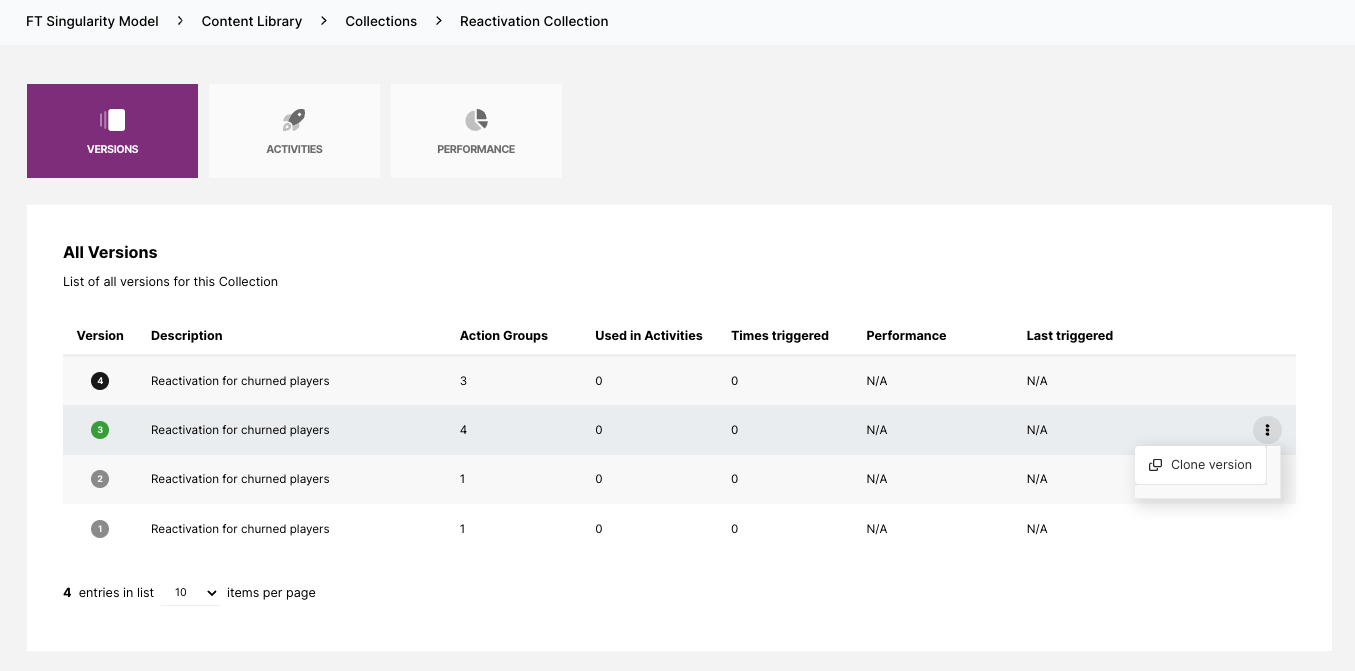 Você encontrará a opção de clonar uma versão ao passar o cursor sobre o