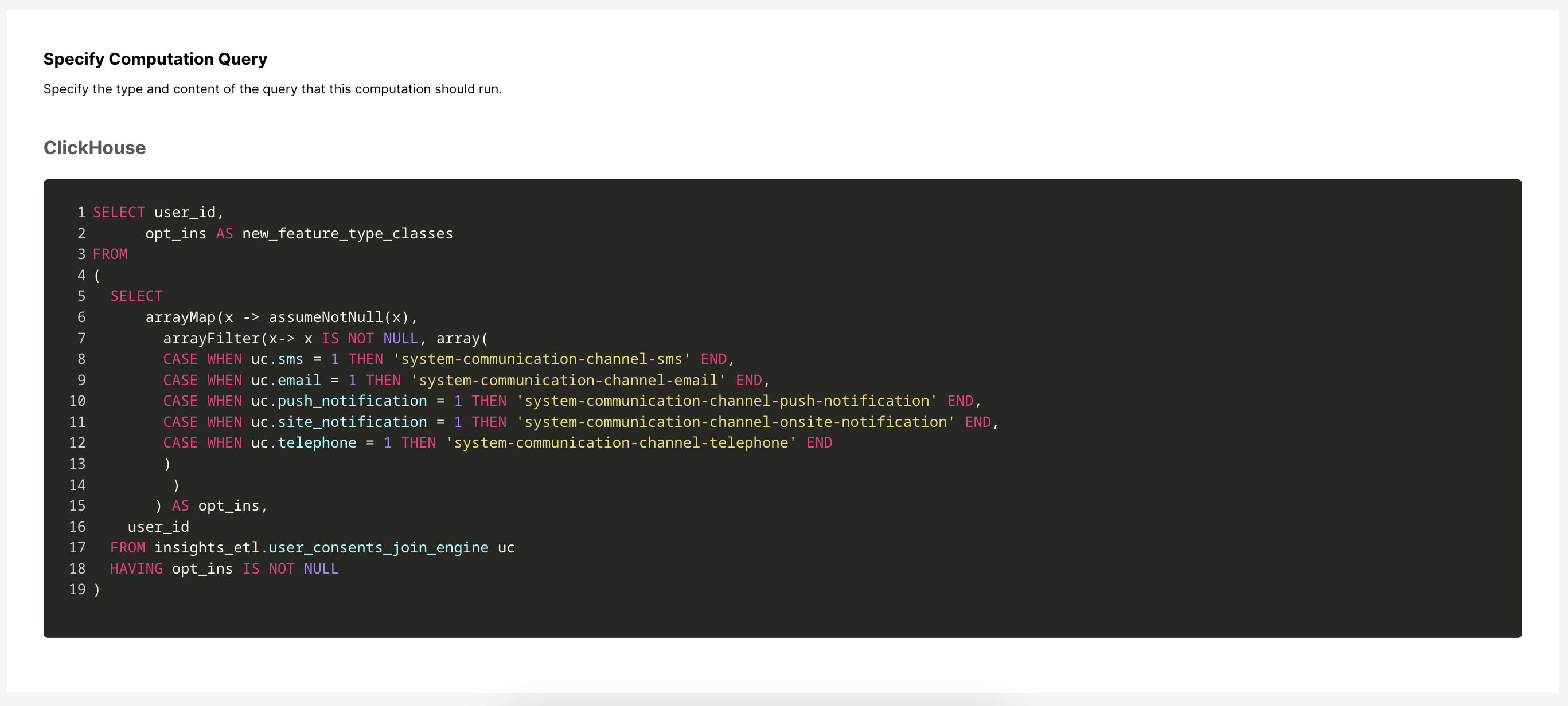 - A consulta analisa o Consentimento do Usuário para todos os diferentes canais de comunicação disponíveis e identifica em quais canais os usuários optaram.