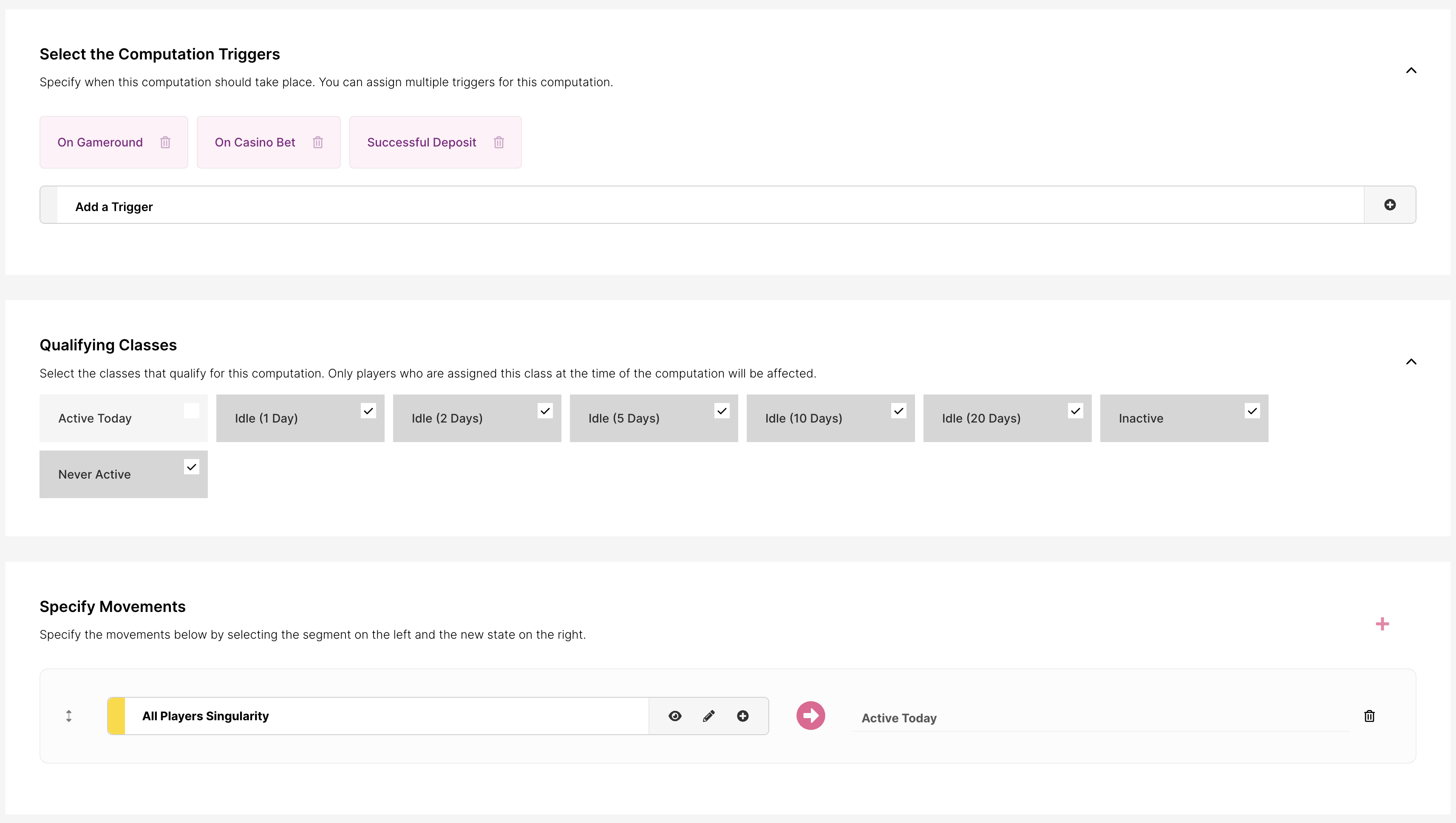 Podem ser movimentos em tempo real, que ocorrem quando ocorre uma ação em tempo real (como um pagamento ou registo), ou uma consulta baseada no tempo. As consultas baseadas no tempo ocorrem a uma hora definida do dia e avaliam a base de jogadores para determinar se um jogador deve mudar de classe.