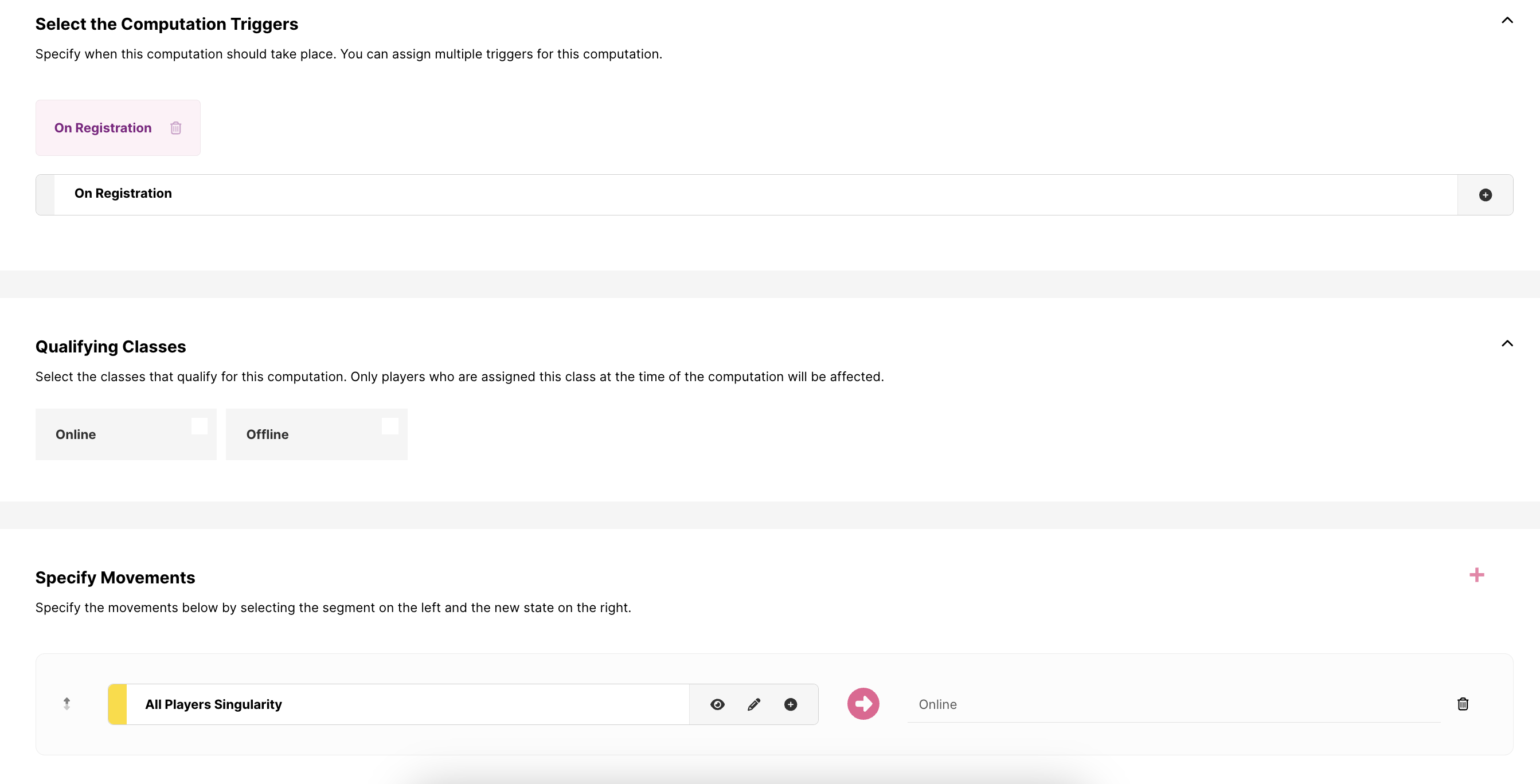 Eles podem ser movimentos em tempo real, que ocorrem quando uma ação em tempo real acontece (como um pagamento ou registro), ou uma consulta baseada em tempo. Consultas baseadas em tempo ocorrem em um horário definido do dia e avaliam a base de jogadores para determinar se um jogador deve mudar de classe.