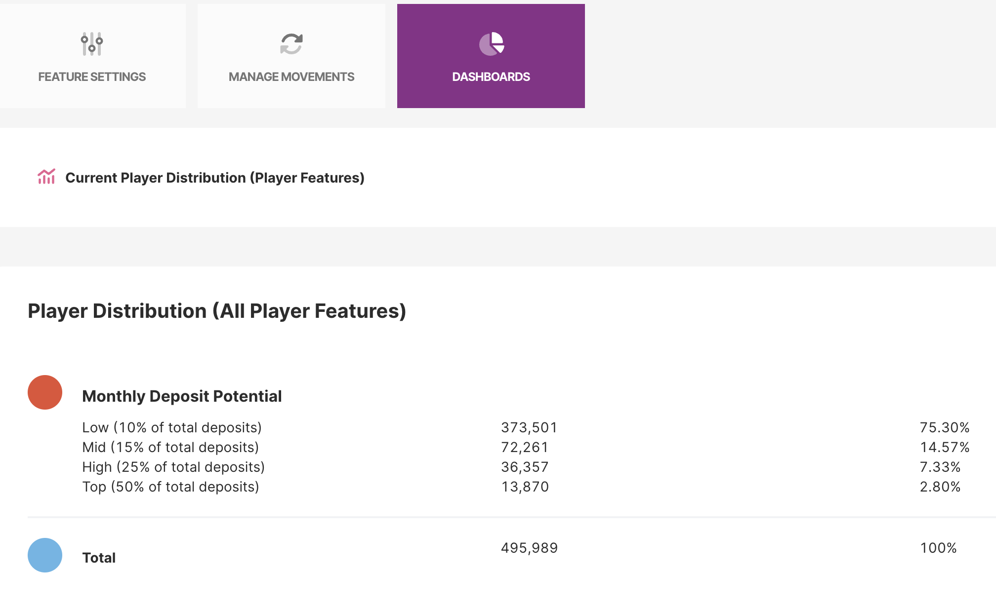 Os jogadores são automaticamente segmentados com base na pontuação de Potencial de Depósito Mensal: