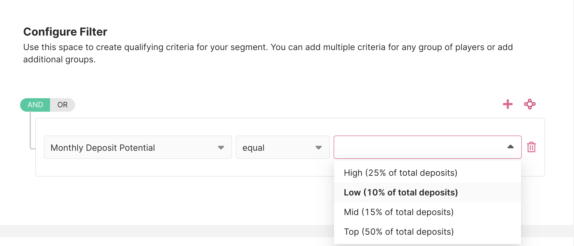 Em seguida, você pode usar o Recurso do Jogador Potencial de Depósito Mensal ao criar segmentos para Atividades e Ciclos de Vida. Você poderá encontrar o Potencial de Depósito Mensal entre os campos de segmento ao criar um segmento.