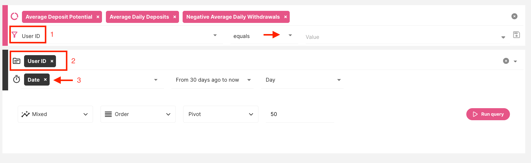 - Depósito Líquido Diário = Calcule cada dia o depósito líquido do jogador como Depósitos - Levantamentos.