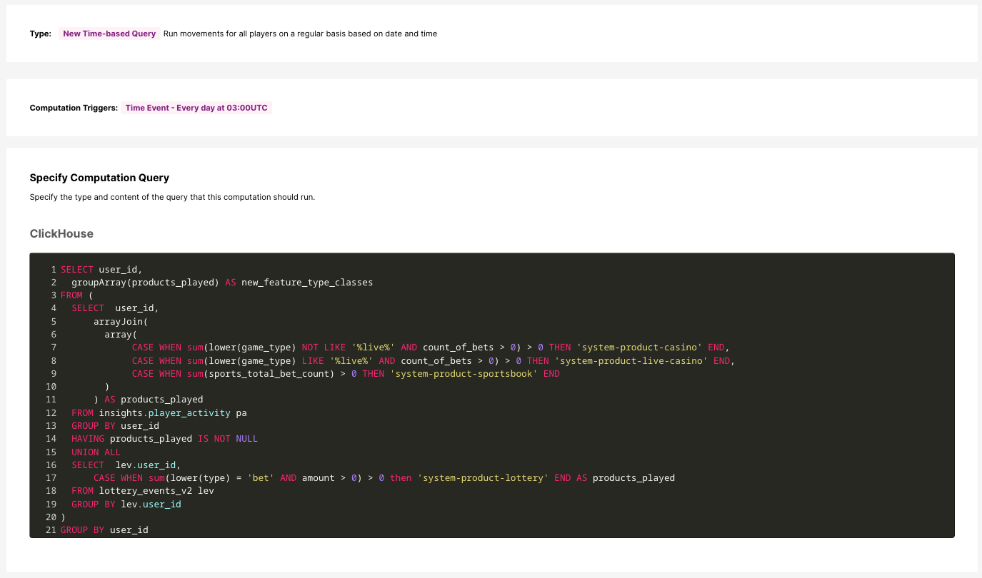 - A consulta analisa todas as apostas que um jogador fez historicamente no site e identifica em quais categorias essas apostas foram feitas. As categorias são então adicionadas à lista de Produtos Jogados Anteriormente desse jogador.