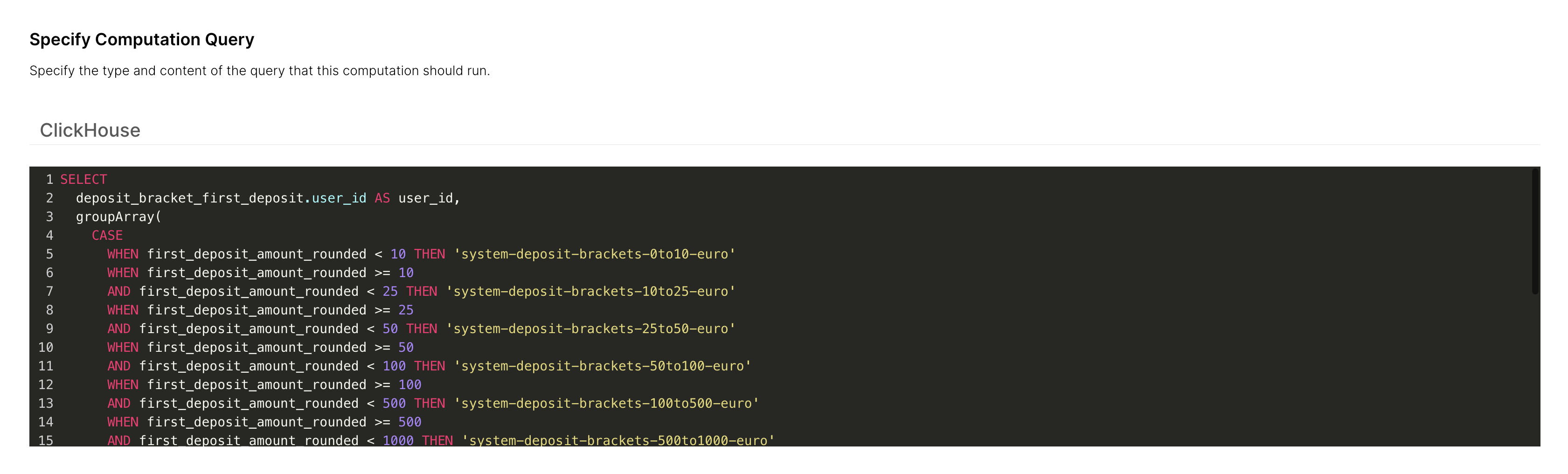 - Esta consulta faz uma verificação histórica do valor do primeiro depósito de todos os jogadores para garantir que pertencem à classe qualificadora correta.