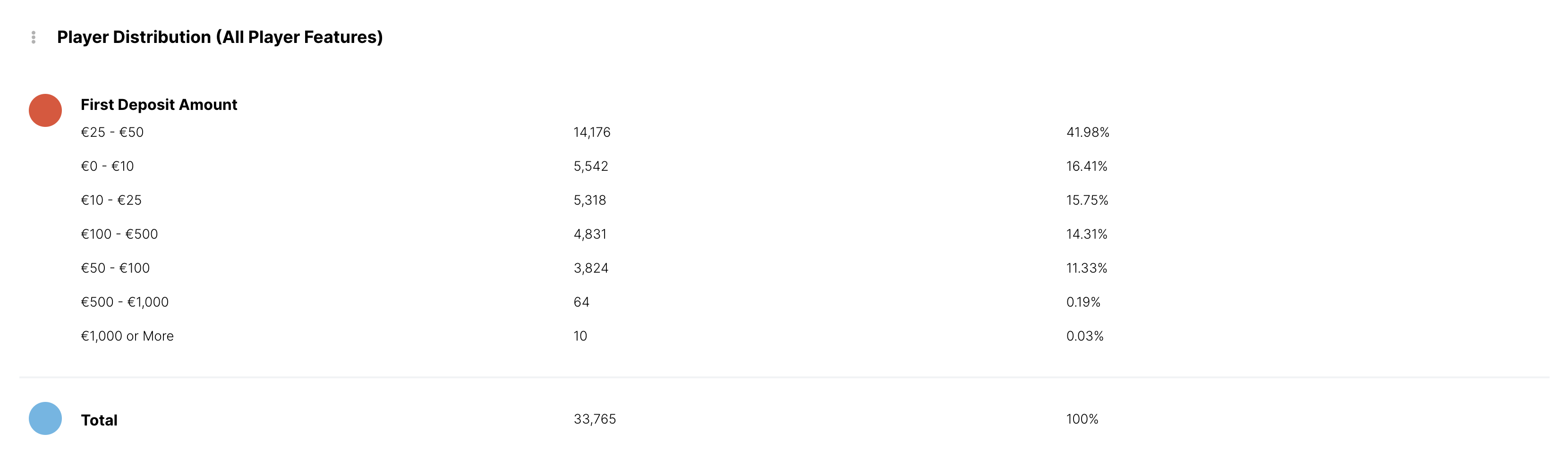 O objetivo da Valor do Primeiro Depósito A funcionalidade do jogador é poder classificar os jogadores com base no valor do seu primeiro depósito. Isso permite compreender quão atraente ou influente é a sua oferta de boas-vindas ao monitorizar as tendências do valor do primeiro depósito.