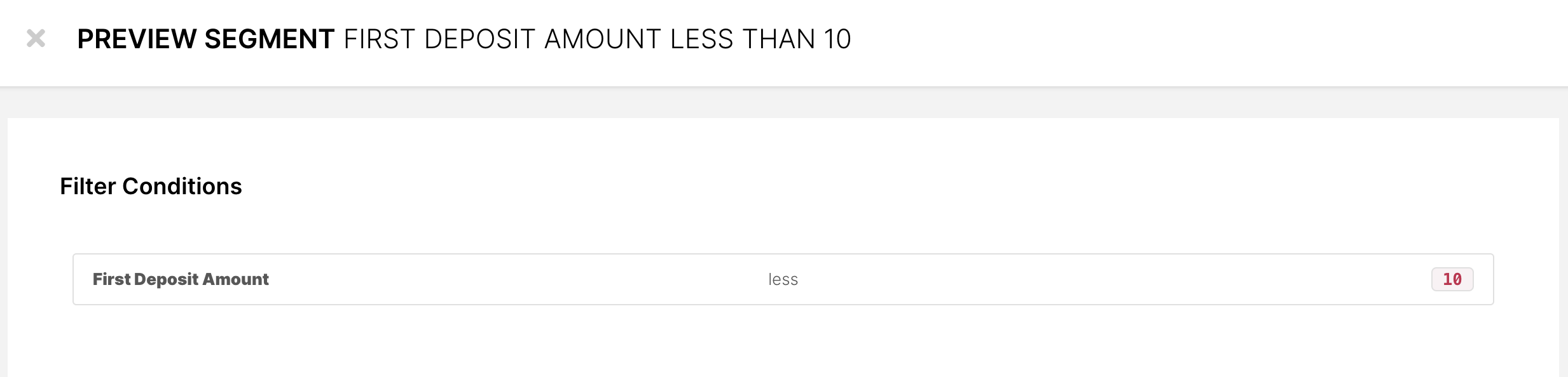 Em seguida, você pode usar Valor do Primeiro Depósito ao criar segmentos para Atividades e Ciclos de Vida. Você poderá encontrar Valor do Primeiro Depósito entre os campos de segmento quando estiver criando um segmento.