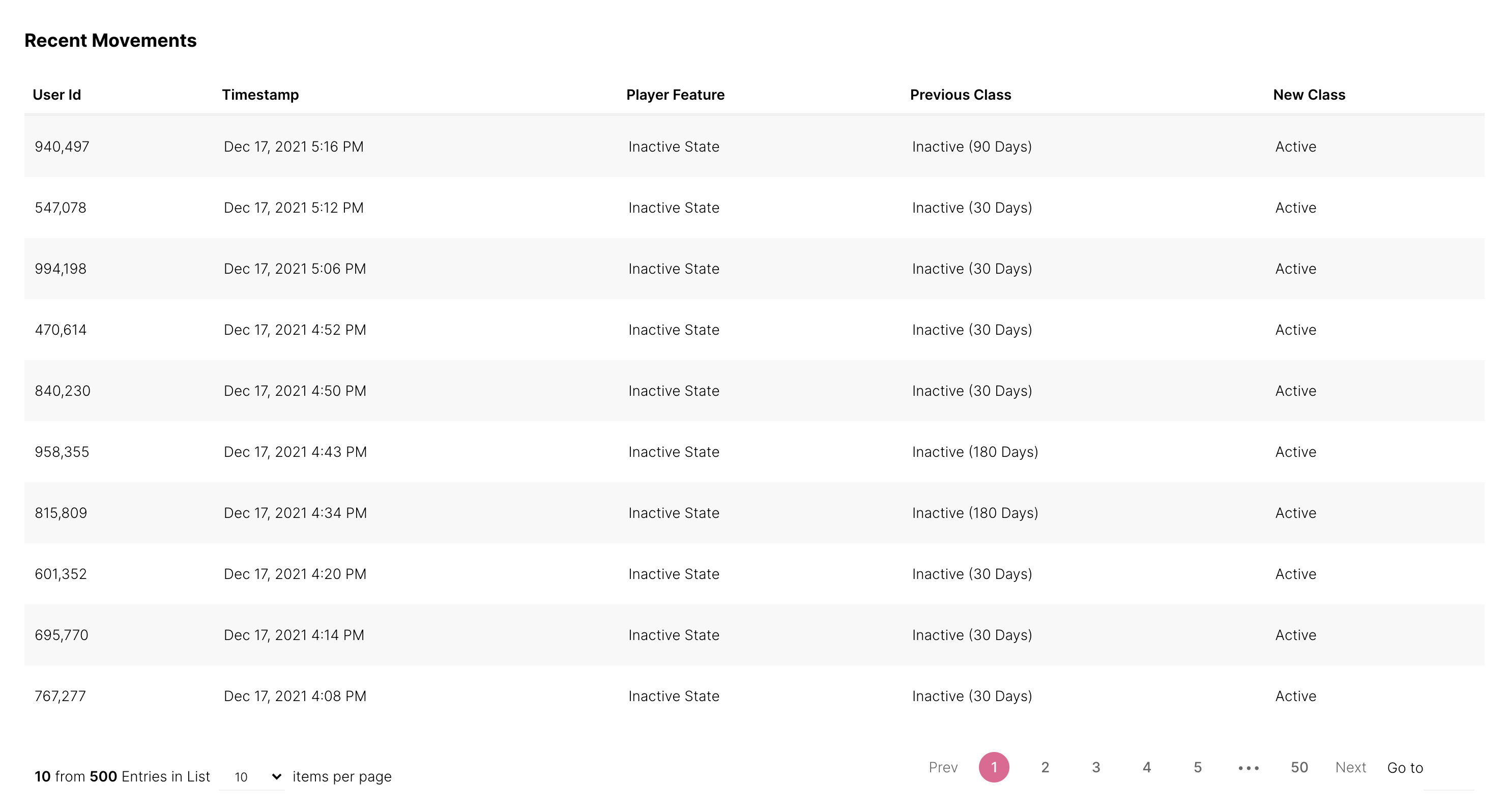 Filtre os últimos 500 movimentos feitos por seus jogadores para ver se você está tendo um impacto positivo. Esta tabela exibe a classe de que cada jogador saiu e para qual classe entrou, junto com um carimbo de data/hora de quando o movimento foi registrado.