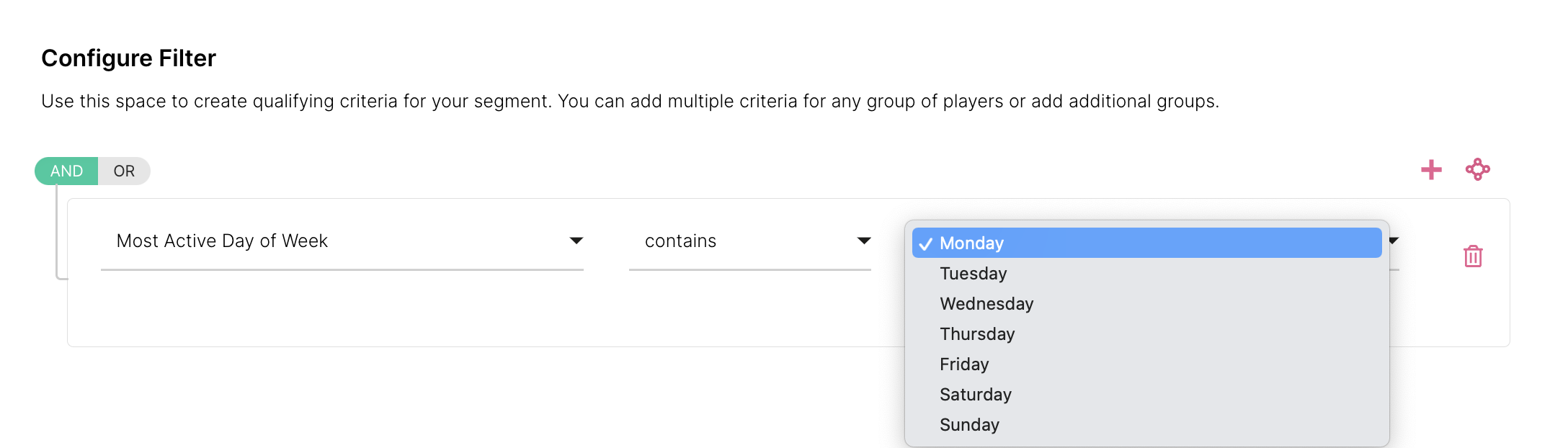 Uma vez configurado, você pode adicionar Player Features ao novo construtor de segmentos; para isso, basta abrir o Player Feature que deseja adicionar e ativar "Adicionar ao Activity & Lifecycle Builder como uma Regra de Segmentação".