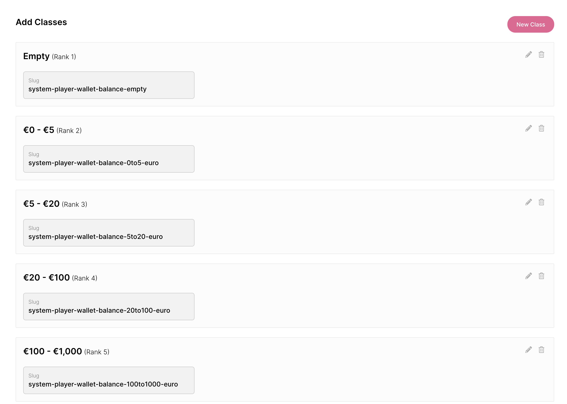 Nota: Essas classes são classificadas, o que significa que os valores têm uma posição ou ordem em relação às outras classes. €0 - €10 é classificado como número 1, o número mais baixo e portanto a classificação mais baixa. Isso significa que quanto maior o valor do depósito, maior será a classe a que o jogador pertencerá.