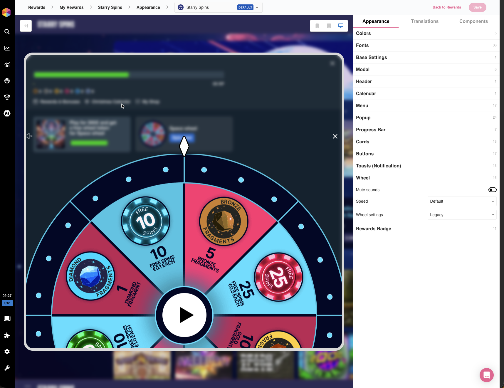 Em nosso exemplo, mostraremos como estilizar o programa de Recompensas para nossos jogadores do Reino Unido no Starry Spins Origem.