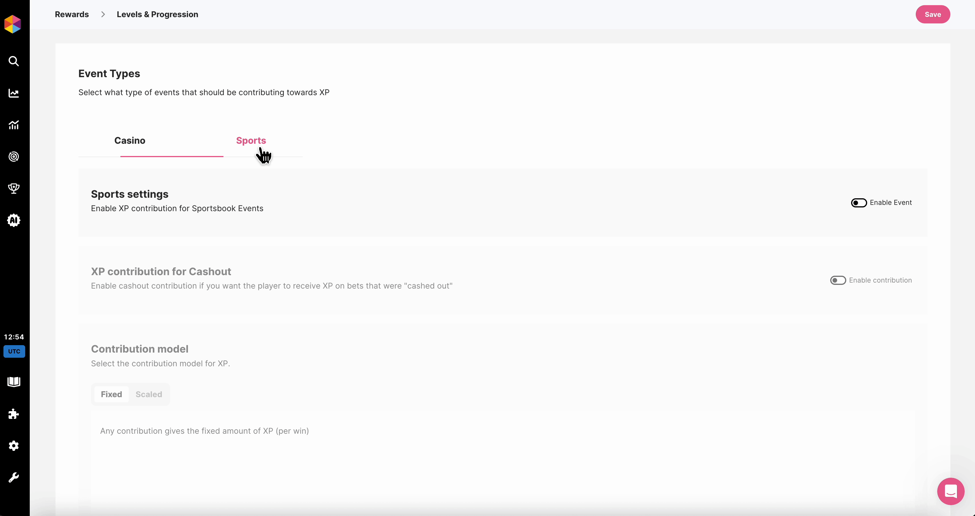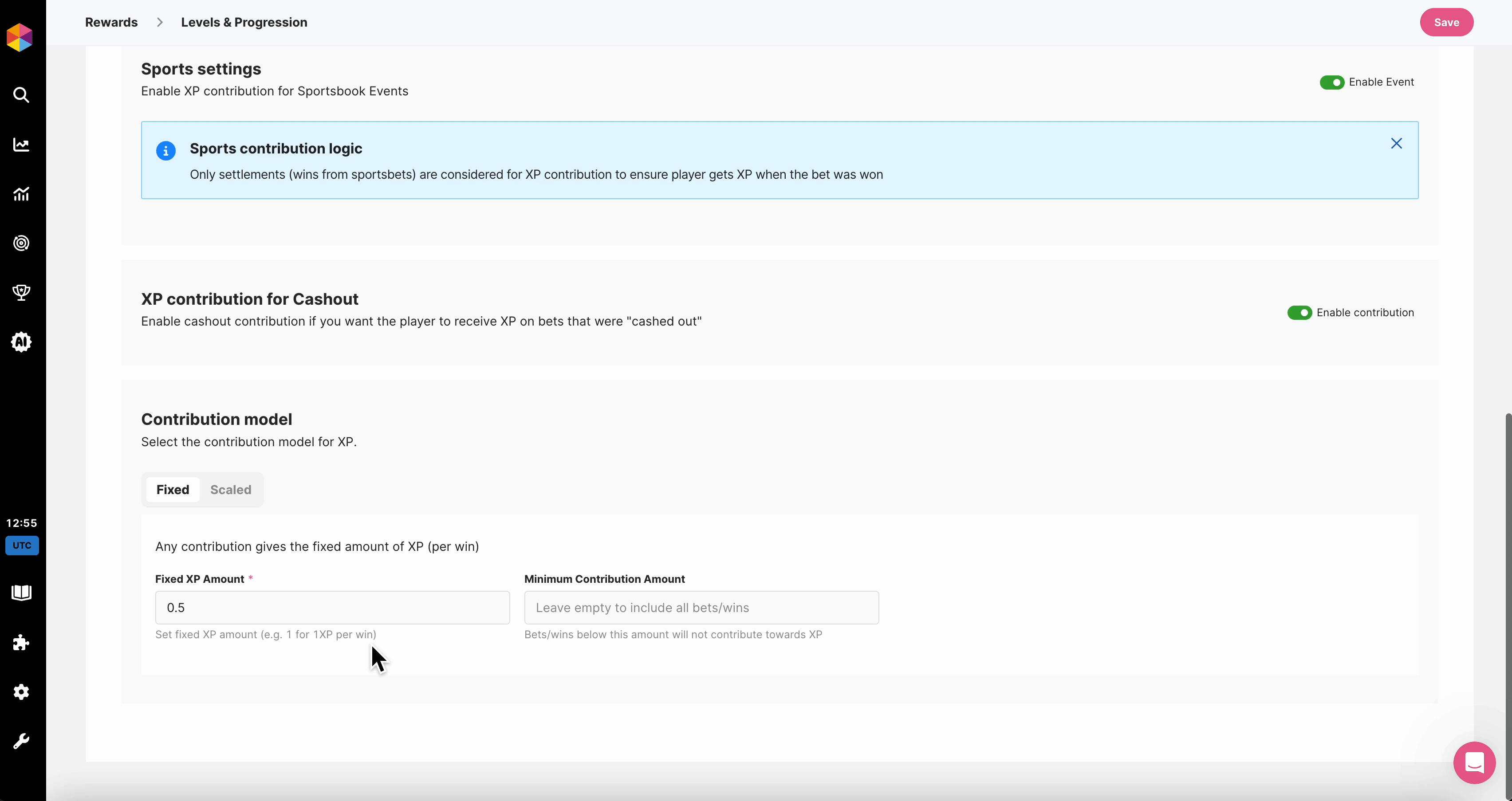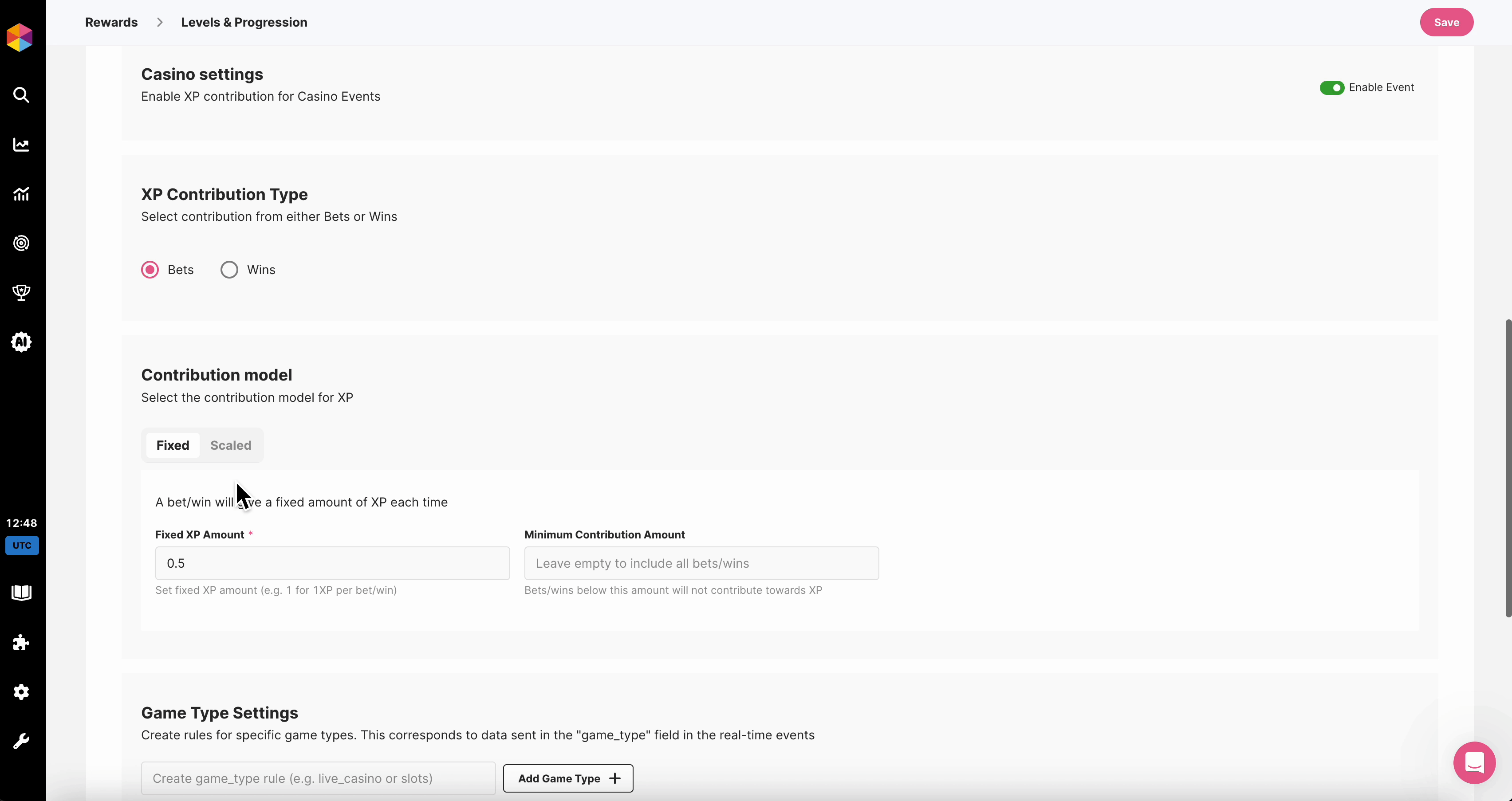 First configure how Casino events contribute to XP — choose which if wins or bets should count, and how XP is calculated. Use minimum and maximum contribution limits to control progression.