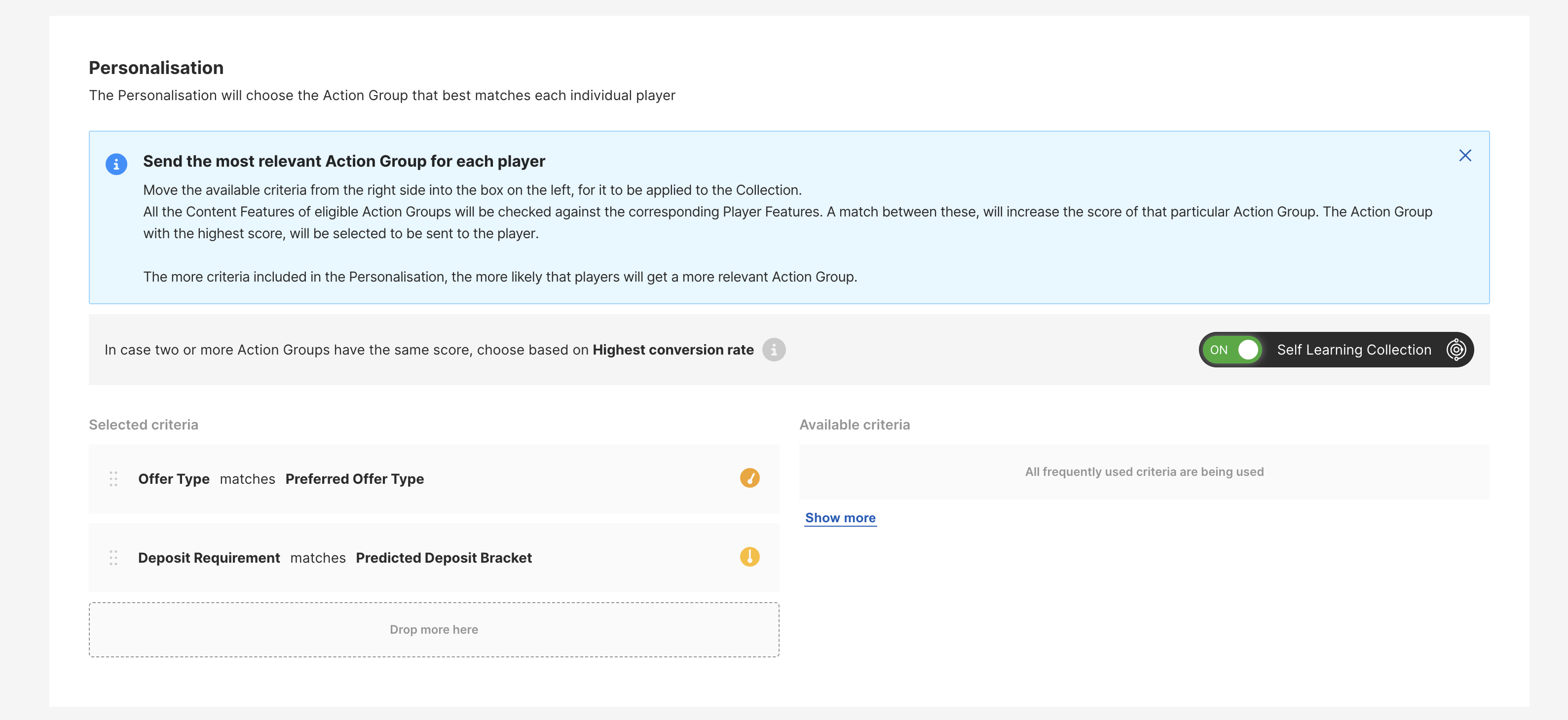 If two or more Action Groups have the same personalisation score, a Self Learning Collection will prioritise the Action Group with the highest conversion rate. If disabled, an Action Group from the ones having the highest personalisation score will be picked at random for the player.