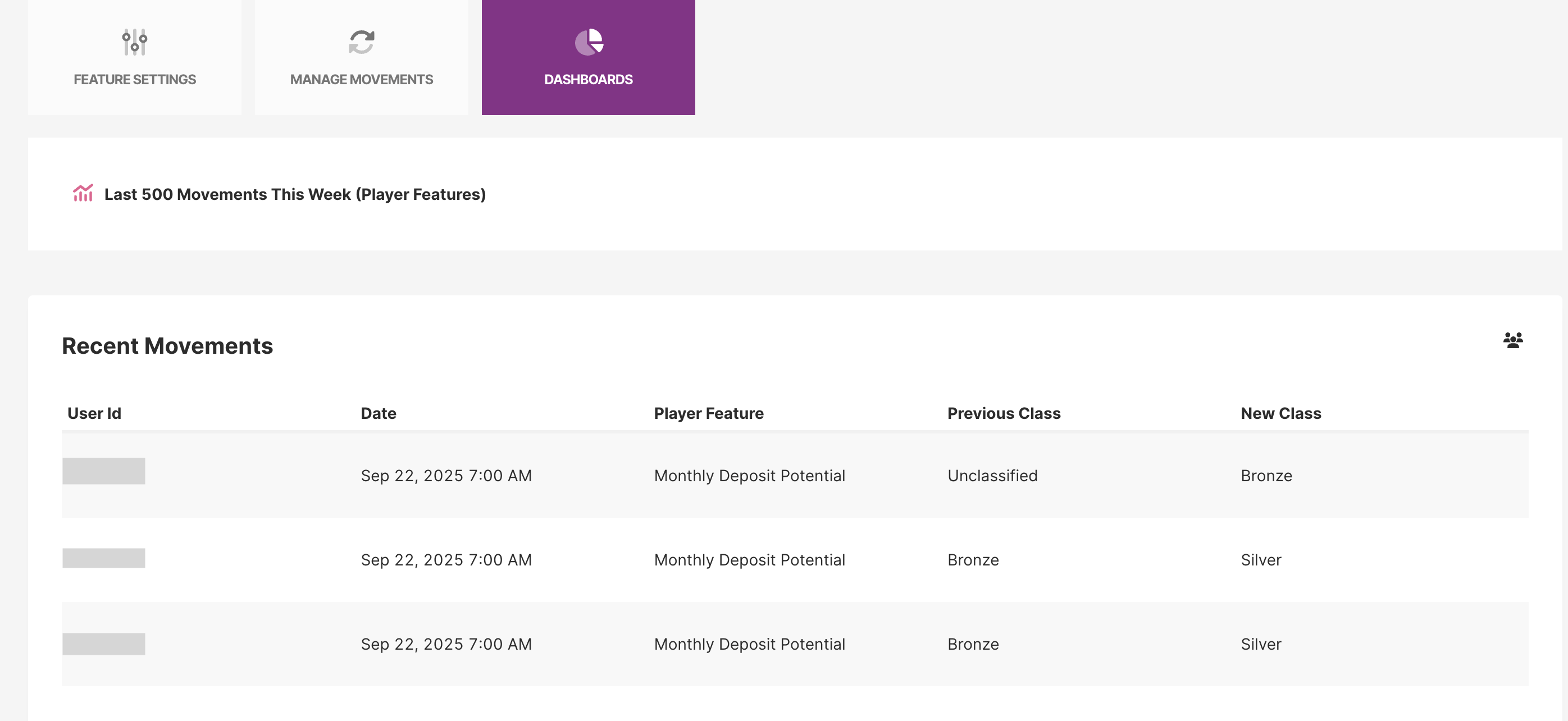 After some time, once the computation triggers have fired, you’ll be able to access two different dashboards with key data about your players inside the Player Feature: